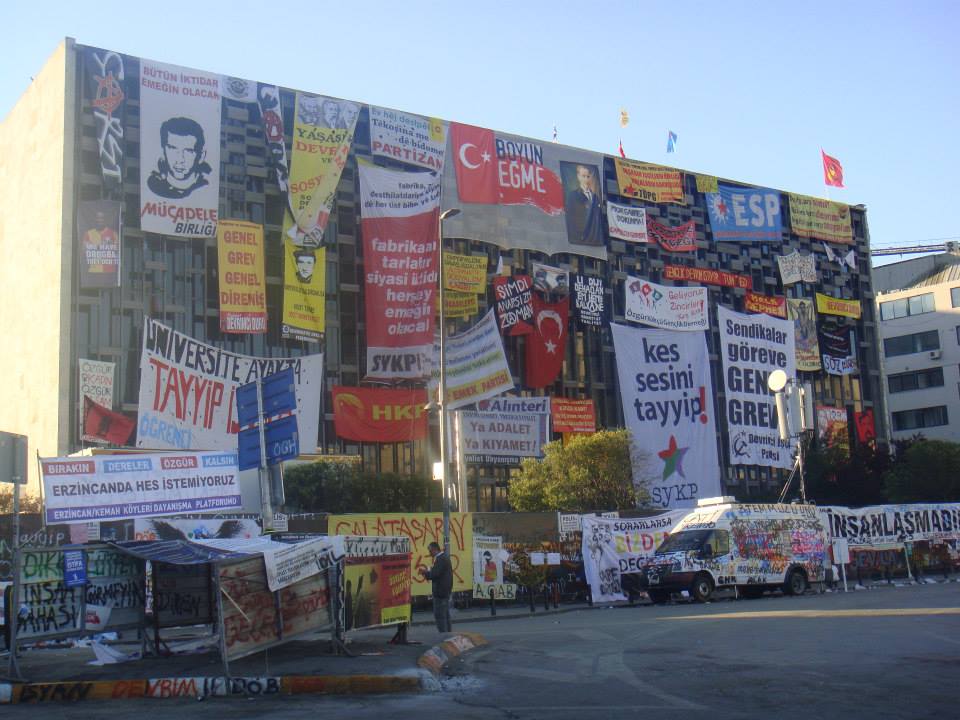 Bu resim tayyibi bahane edip devlete saldıranların Atatürk Kültür Merkezine astıkları paçavraları gösteriyor.